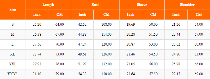 | Size | Length | Bust | Sleeve | Shoulder | ||||