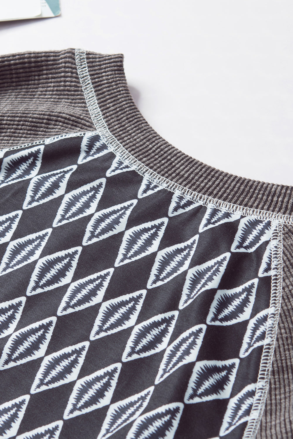 - Fashion meets comfort with our Aztec Patchwork Ribbed Long Sleeve Top
