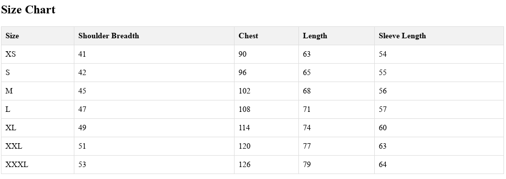 | Size | Shoulder Breadth | Chest | Length | Sleeve Length |